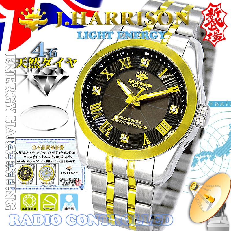 ジョン・ハリソン JH-096A-MGB・4石天然ダイヤモンド付・メンズソーラー電波時計