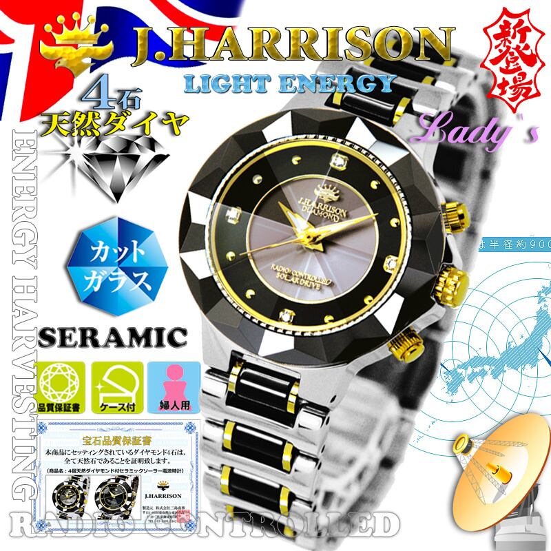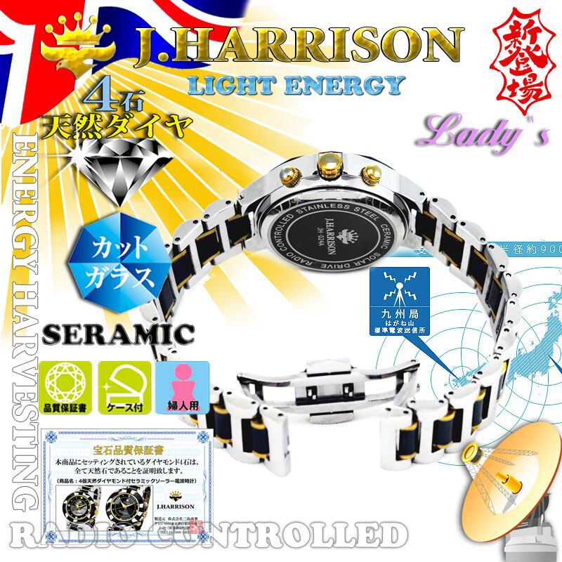ジョン・ハリソン JH-024A-LBB 4石天然ダイヤ付・セラミック使用・ソーラー光発電電波婦人用時計